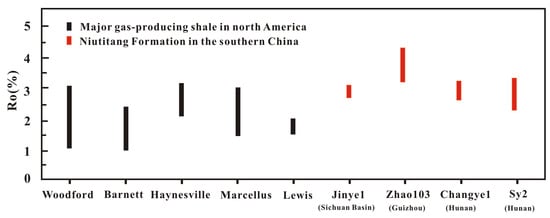 The TOC content is between 0.58% and 7.06%, with an average of 2.51%. The primary maceral of the OM (organic matter) is amorphous sapropel, with a mean value of 85.8%. Amorphous sapropel indicates that the shale contains mainly Type II1 kerogen, also supported by the results of the type index (TI) (Table 1). Ro values vary from 2.24% to 3.42%, with most values greater than 3%, indicating a high over-mature stage of hydrocarbon development. The Ro values of the Niutitang shale from a different region of southern China are similar, ranging between 2.0% and 4.5%, typically 2.5% to 3.5% (Figure 2); but the Ro values of the Niutitang Formation is obviously higher than that of typical shale gas plays from North America (Figure 2). The low hydrogen index (HI) and S2 values (Table 1) indicate that the shale has a poor hydrocarbon generation potential at present day, probably because of the high maturity [].