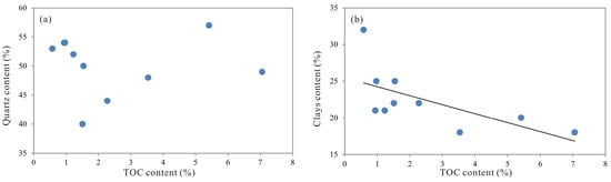 Relationships between total organic carbon (TOC) content and quartz content (a) and clay content (b).