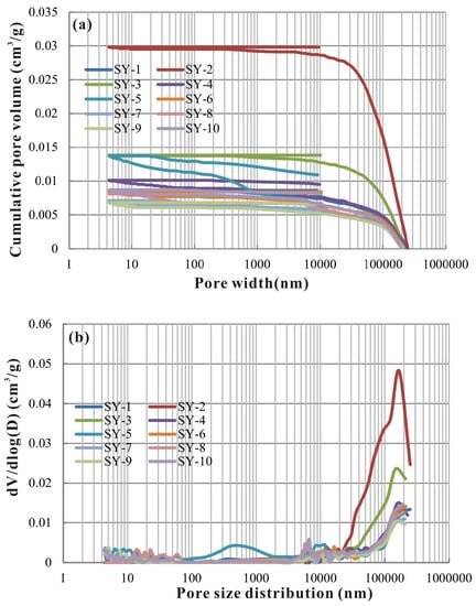 Mercury intrusion was conducted under pressures up to 215 MPa, which was primarily used to analyze PSD in the range of 6 nm–20 μm according to the Washburn equation []. The 10 samples had similar mercury intrusion curves, which were characterized by narrow hysteresis loops (Figure 4a). Figure 4a shows that a large amount of mercury invaded pores larger than 10 μm in the initial stage (especially for sample SY-2) and then only a small amount of mercury invaded pores between 50 nm–10 μm. Finally, the mercury injection curves had small increments of pores less than 10 nm in size, which could be observed in most samples. All samples had nearly flat mercury ejection curves, which indicated the existence of large amounts of mercury in the pore network after removal and poor connectivity between pores. Also, the pores were mostly ink-bottle-shaped in the samples, which is adverse for shale gas seepage and diffusion. The characterization of mercury injection-ejection curves is consistent with the PSD where pores with diameters greater than 10 μm are well developed in all samples, as shown in Figure 4b; however, pores with diameters between 50 nm and 10 μm are not extensively developed, except for sample SY-5 with a peak at 400–600 nm.