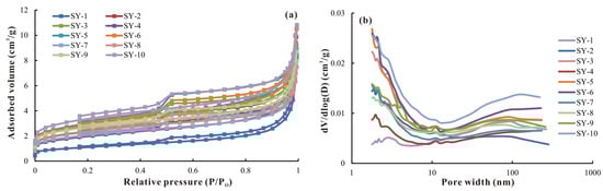 (a) Low-temperature N2 adsorption–desorption isotherms for the shale samples and (b) pore size distribution derived from isotherm N2 adsorption branches using the BJH model.
