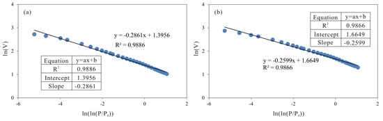 Plots of ln(V) vs. ln(ln(P0/P)) reconstructed from the N2 adsorption isotherms of two typical shale samples: (a) Sample SY-1 and (b) Sample SY-2.