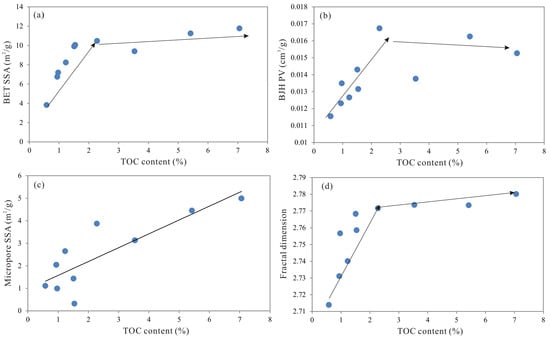 The relationships between TOC content and pore structure parameters are shown in Figure 7. A positive relationship was observed between TOC content and BET SSA and BJH PV (Figure 7a,b), which was consistent with several previous studies [,,,]. However, we note that correlations with BET SSA were stronger than they were with BJH PV. In general, there was a clear positive relationship between TOC content and micropore PV and SSA, as proposed by many studies, indicating that most of the OM pores were micropores [,]. The micropore SSA contribution to total SSA was more significant than the micropore PV contribution to total PV. As shown in Figure 7c, there was a clear positive relationship between TOC content and micropore SSA. Therefore, higher TOC resulted in the growth of the number of micropores, which mainly contributed to SSA. The increasing SSA and PV with increasing TOC content of the shale samples may have also directly contributed to the positive relationship between fractal dimension and TOC content (Figure 7d), which has also been observed in Longmaxi and Niutitang shale from southern China [,] and in continental shale from the Ordos Basin [].