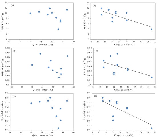 As for clay minerals, a slight negative relationship is observed in Figure 8d–f, indicating that SSA and PV decreased with increasing clay mineral content, which could weaken the heterogeneity of the pore structure. Higher clay content may allow the collapse of OM pores and interparticle pores [,], especially for Niutitang shale that has been deeply buried and has undergone immense compaction. In addition, in Section 3.2, the clay content had a negative relationship with TOC content, which in turn had a positive influence on pore structure. Therefore, the negative trend between clay minerals and TOC has, to a certain extent, contributed to the negative relationship between clay minerals and pore structure parameters. Furthermore, clay minerals contain more adsorbed water than OM and shale samples with a higher clay mineral content had more homogeneous pore systems due to pore filling by water molecules. This negative relationship between fractal dimension D and clay mineral content was also observed by Ji et al. []. Yao et al. proposed that coal with a higher water content has a lower fractal dimension [].