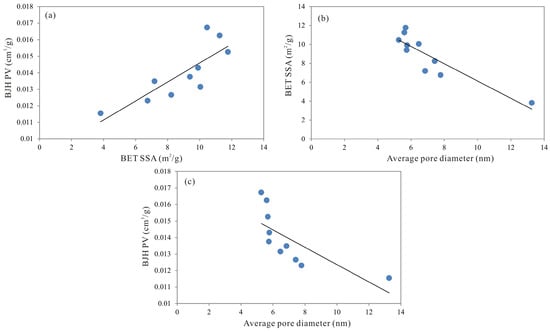 (a) Relationship between SSA and PV and (b) relationships between average pore diameter and PV, (c) SSA.