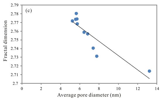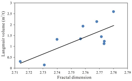 The Langmuir volumes of the shale samples had a positive relationship with fractal dimension (Figure 14), which was consistent with many previous studies of coal and shale [,,,]. The higher fractal dimension values represented a rough and irregular surface, which provided more adsorption sites and resulted in higher adsorption capacity. According to the results from this study, a higher fractal dimension D resulted in a smaller average pore diameter. Adsorption potential energy is related to the interaction forces between a solid surface and gas molecules and a smaller pore size indicates stronger adsorption potential energy, which results in a greater adsorption interaction between gas molecules and pore surface []. Therefore, a higher fractal dimension promotes the adsorption capacity of shale. It is favorable for gas accumulation.