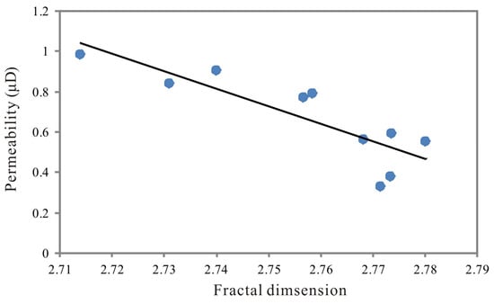 As shown in Figure 12, permeability had a negative relationship with fractal dimension. This showed that fractal dimension had a greater influence on the flow capacity of the shale. Higher D values indicate more small pores or pore throats and more heterogonous and complicated pore structure, which results in a low permeability. This inhibits gas flow through the shale. Yang et al. and Liu et al. also found that a higher fractal dimension D indicates a more complicated pore structure, leading to a decrease of permeability [,]. In addition, they suggested that pore shapes transform gradually from relatively regular (e.g., wedge-shaped) to complex (e.g., inkbottle-shaped) with an increase in the fractal dimension, which may be one of the reasons that shale with a higher fractal dimension value has lower permeability. For example, the sample with the lowest permeability value (0.33 μD; SY-5) has a hysteresis loop that can be characterized as almost a Type H2, while the sample with the largest permeability (0.981 μD; SY-1) has a hysteresis loop that can be characterized as a Type H3 (Figure 5). The inkbottle-shaped pores are more likely to be better developed in the sample SY-5, which would enhance pore structure complexity and results in a low permeability and a large fractal dimension D (Table 4).