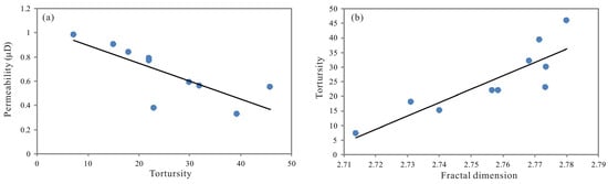 In addition, Chen et al. proposed that tortuosity (τ), which can be calculated through mercury intrusion, can be used to evaluate pore connectivity and permeability [], with higher τ values indicating poor connectivity and low permeability (Figure 13a). As shown in Figure 13b, tortuosity (τ) had a positive relationship with the fractal dimension, indicating that shale with a higher fractal dimension D had poorer connectivity and lower permeability.