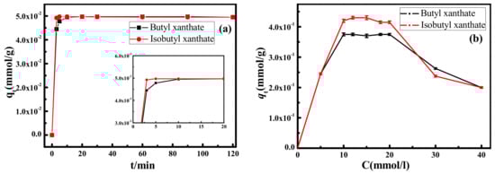 To evaluate the influences of xanthate concentration on the adsorption process, the adsorption of xanthates onto pyrite surface were implemented at various concentrations (from 0 to 40 mmol/L). As can be observed in Figure 2b, the equilibrium adsorption capacity qe (mmol/g) of butyl xanthate and isobutyl xanthate are increasing gradually, which reach 0.375 ± 0.005 and 0.430 ± 0.005 mmol/g in the range of 10–20 mmol/L, respectively. However, outweighing 20 mmol/L, the equilibrium adsorption capacity qe (mmol/g) declines gradually, which is attributed to the super saturation of the xanthate solution on pyrite surface, increasing the electrostatic repulsion force between molecules [].