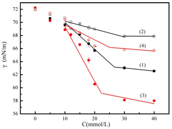 Surface tension measurements were conducted by the pendant drop (PD) method using a JC2000D1 contact angle measuring instrument (POWEREACH, Shanghai, China). A small amount of liquid was required, and a controlled atmosphere inside the measuring cell was easily achieved []. The temperature was maintained at 25 °C by circulating thermostated water through a jacketed vessel that contained the solution during the measurements. Each sample was allowed to attain equilibrium for 10 min at each measurement []. The measurements were taken until surface tension values were constant, which demonstrated that the equilibrium had been reached []. In order to ensure the accuracy of the parameters, all experiments were repeated at least three times to obtain the average. The values of the surface tension at the CMC (γcmc) and the critical micelle concentration (CMC) were determined from the intersection of the two straight lines drawn in low and high concentration regions in surface tension curves (γ-C curves) via a linear regression analysis method [].