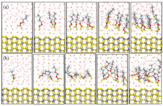 Equilibrium configurations of different butyl xanthate concentrations on pyrite surface in aqueous solution (a) NVT; (b) NPT; (Color codes: red = O, white = H, yellow = S, grey = C, iron grey = Fe, purple = Na; The above pictures is 1, 3, 5, 8, and 10 numbers of xanthate, respectively).