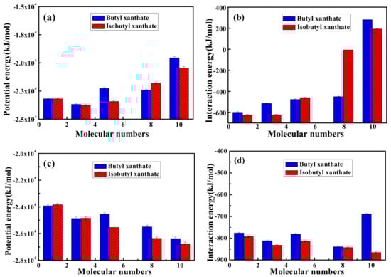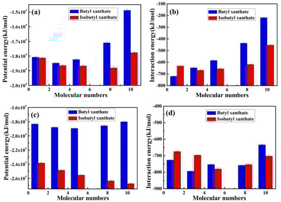 All equilibration configurations obtained were used to compute the total potential energies of the MD systems and interaction energies between pyrite surface and xanthate solutions, which can be compared relatively within a given set of simulations but not to experimental values []. The potential energy and interaction energy between pyrite surface and different xanthate concentrations were displayed in Figure 6. As can be seen from Figure 6a,b, the interactions between pyrite surface and xanthate solutions rise gradually and then decline due to the electrostatic repulsion of xanthates adsorbed on pyrite surface. As shown in Table 3, it is obvious that the electrostatic repulsion are rising dramatically due to the increase of xanthate concentrations, resulting in the decrease of the interaction energies. In addition, the interaction energy between pyrite surface and isobutyl xanthate is greater than that of butyl xanthate in Figure 6b. By comparison, the interaction energies of butyl xanthate and isobutyl xanthate with pyrite in Figure 6d are in compliance with the results in Figure 6b. Moreover, the interaction energies are larger for NPT ensemble. However, there is a large difference in total potential energies for NVT or NPT ensemble in Figure 6a,c. The interpretation could be deduced as follows. For NVT ensemble, the volume of the system being fixed, the pressure of the system rises gradually with the increase of xanthate concentrations, thus the total potential energies rise gradually and then decline because of the electrostatic repulsion. With the pressure of the system being fixed, the volume of the system can change for NPT ensemble. It can be found that the volume of the system has a slight rise with increase of xanthate concentrations. Compared with NVT ensemble, the system can relax completely in NPT ensemble, and the electrostatic repulsion is smaller. In conclusion, the system of NPT ensemble may be more stable for the interaction between xanthate and pyrite. Therefore, we will apply this method in subsequent research. These results demonstrate that the adsorption of isobutyl xanthate on the pyrite surface is easier, which is consistent with adsorption experimental results that we obtained.