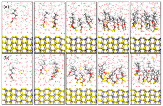 MD simulations of xanthates adsorbed on pyrite (100) surface were performed in an attempt to understand the interactions between pyrite surface and various xanthate concentrations in aqueous solutions. The optimized equilibrium configurations between pyrite surface and xanthates were shown in Figure 4 and Figure 5. According to the equilibrium configuration of the different xanthates adsorbed on pyrite (100) surface, it was found that the hydrophilic head groups of xanthates were adsorbed on the pyrite surface, which demonstrated that xanthate anions were the effective component during the flotation process. The hydrophobic groups of xanthate stretch toward the solution and form a hydrophobic membrane, producing a hydrophobic state.