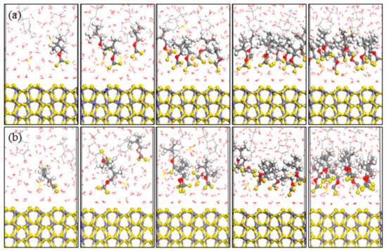 In recent years, molecular dynamic (MD) simulations is a valuable tool to study the adsorption of surfactants on solid surfaces at the microscopic level [,,], which makes it possible to accurately interpret the flotation chemistry of the collector on solid–water interface through constructing a computational model that tends to real flotation environment. Moreover, MD simulations can elucidate the dynamic characteristics of the flotation process []. Wang et al. [] revealed that the dodecylamine molecules adsorbed on muscovite surface by electrostatic interactions and hydrogen bonding, while the oleate molecules could co-adsorb with the dodecylamine molecules on the muscovite surface by MD simulations.