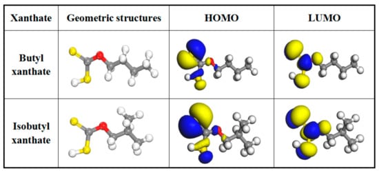Optimized molecular structures and frontier molecular orbital of butyl xanthate and isobutyl xanthate (Color codes: red = O, yellow = S, white = H and gray = C).