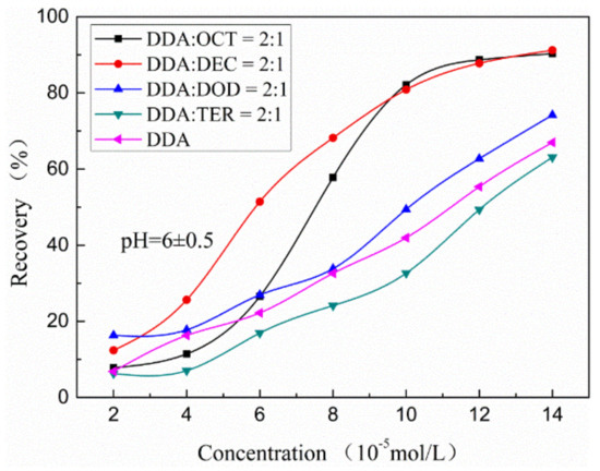 The muscovite-collecting power of mixed DDA/alcohol (OCT or DEC) collector systems is stronger than that of the single DDA collector system. Mixed DDA/alcohol (OCT, DEC, or DOD) collector systems can attain a muscovite recovery rate of 80%. Saturation can be obtained with 10−4 mol/L 2:1 DDA/OCT or 2:1 DDA/DEC. This result indicates that out of all mixed collector systems, the DAA/OCT and DDA/DEC mixed collector systems exhibit the most significantly positive synergistic effects on muscovite flotation. The mixed DDA/DOD recovery system has a muscovite recovery rate of 49%, which is slightly higher than that of the single DDA system. However, muscovite recovery by the mixed DDA/TER system (33%) is lower than that by the mixed DDA system (41%).