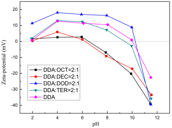 The zeta potential test shows that muscovite is negatively charged almost over the entirety of the pH range. DDA adsorbs on muscovite, which is negatively charged, through electrostatic force. This phenomenon shifts the zeta potential of muscovite to a positive value. Under the DDA concentration of 10−4 mol/L, the presence of OCT can promote DDA adsorption on the muscovite surface. DOD has the strongest promoting effect on the adsorption of DDA on the muscovite surface. This effect may be attributed to the similar carbon-chain lengths of the two compounds that enable the formation of tightly adsorbed layers through synergistic adsorption.