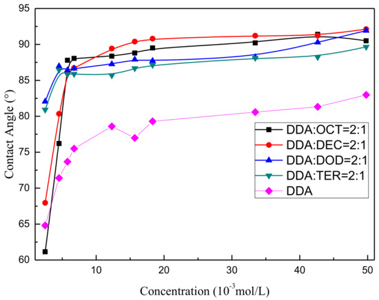 Contact angle measurements were obtained to study the effects of the wettability of each mixed collector on the mineral surface and thereby confirm that synergistic effects exist between alcohols with different carbon-chain lengths and DDA on the solid–liquid interface [27,28]. The contact angle of muscovite as a function of mixed collector dosage under pH 6 ± 0.5 and treatment with 2:1 DDA/OCT, 2:1 DDA/DEC, 2:1 DDA/DOD, 2:1 DDA/TER, and pure DDA was observed. The results are presented in Figure 4 and indicate that the contact angle of muscovite first increases, then maximizes, and finally remains steady under increasing collector concentrations. Under relatively low collector concentrations, different combinations of different reagents exert different effects on the contact angle of muscovite, and contact angle increases in the order of mixed DDA/DOD > mixed DDA/TER > mixed DDA/DEC > mixed DDA/OCT > pure DDA. This order reflects the hydrophobicity degree of the mineral surface and the strength of the synergistic adsorption of different kinds of alcohols and amines. The high synergistic adsorption strength of the mixed DDA/DOD system may be related to their similar carbon-chain lengths. Under relatively high collector concentrations, the contact angles of muscovite in each mixed system reach saturation, and the contact angle value increases in the order of mixed DDA/DEC > mixed DDA/OCT > mixed DDA/DOD > mixed DDA/TER > pure DDA. This result is consistent with the results for muscovite flotation.