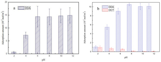 The adsorption amount of DDA collectors as a function of pH is discussed in this section. The adsorption amounts at the given initial DDA concentration (CDDA = 10−4 mol/L) under increasing pH are presented in Figure 5. Figure 5a shows that the adsorption amount of DDA increases sharply with increasing pH and is maintained at approximately 1.4 × 10−6 mol/m2 when the solution pH exceeds 6.