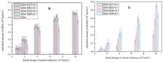 The muscovite-adsorbed amounts of DDA as a function of the initial dosages of 2:1 DDA/OCT, 2:1 DDA/DEC, 2:1 DDA/DOD, 2:1 DDA/TER, and DDA under pH 6 ± 0.5 are presented in Figure 6a. The results show that the muscovite-adsorbed amount of DDA increases as the initial concentrations of mixed collectors increases. In addition, under the same reagent concentration, the amount of muscovite-adsorbed DDA under each mixed collector system is significantly higher than that of DDA alone. These findings indicate that the addition of alcohol enhances DDA adsorption on muscovite. Nevertheless, the different types of alcohols in the mixed collector systems do not significantly affect the amount of muscovite-adsorbed DDA.