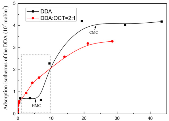 The isotherm of DDA adsorption on muscovite under treatment with DDA alone and the mixed DDA/OCT collector system at pH 6 ± 0.5 and 25 °C are presented in Figure 7. The trend of DDA adsorption on muscovite agrees with the typical four-step adsorption theory: Adsorption initially increases, plateaus, and then sharply increases until the final saturated adsorption state is reached. At low concentrations (I), the positively charged DDA and negatively charged muscovite interact through ion exchange and electrostatic adsorption. Thus, the adsorption isotherm sharply increases. As the equilibrium concentration of DDA increases (II), negative charges on the muscovite surface are neutralized, consequently weakening electrostatic interactions between muscovite and DDA. The adsorption force between DDA and muscovite is dominated by weak van der Waals forces. This phenomenon is represented by the weak curve of the adsorption isotherm. When the DDA concentration continues to increase to the critical hemimiceller concentration (HMC) value (III), the adsorption amount of DDA increases sharply as a result of hydrophobic associations among nonpolar carbon chains. Finally, the DDA concentration reaches the critical miceller concentration (CMC) value (IV), which tends to reach saturation as a result of micelle formation. Comparing the measured DDA adsorption isotherm with its standard adsorption isotherm model reveals that that the inflection point concentration (CMC value) reaches saturation adsorption at approximately 2 × 10−2 mol/L.