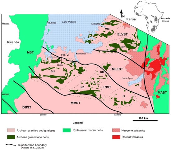 Geological map of the northern half of the Tanzania Craton, showing the main geological and tectonic units: IS—Iramba-Sekenke Greenstone Belt; KF—Kilimafedha Greenstone Belt; MM—Musoma-Mara Greenstone Belt; NZ—Nzega Greenstone Belt; SM—Shinyanga-Malita Greenstone Belt; SU—Sukumaland Greenstone Belt. Super-terrane boundaries are as proposed by [27]: DBST—Dodoma Basement; ELVST—East Lake Victoria; LNST—Lake Nyanza; MAST—Mbulu-Masai; MLEST—Mwanza Lake Eyasi; MMST—Moyowosi-Manyoni; NBT—Nyakahura-Burigi. The inset map of Africa shows the location of Archaean blocks. The figure has been adapted from [25]. The red square shows the study area as shown in Figure 2.