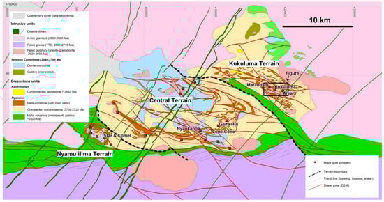 Geological map of the Geita Greenstone Belt, showing the location of the major gold deposits and the main geological terrains, lithological units, and structures (listed ages from [25,28,29]). The insert shows the study area in Figure 3. The grid is in UTM WGS84, zone 36S.