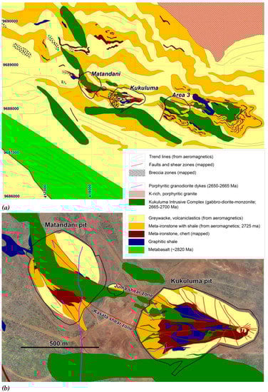 (a) Geological map of the central Kukuluma Terrain, showing the position of the main gold deposits in the area. The distribution of the meta-ironstones in the area is derived from geophysics. Map projection is UTM WGS84 zone 36S; (b) Close-up view of the Matandani and Kukuluma pits. The age estimates in the legend are from [28,29,30].