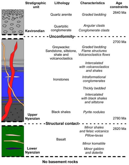 - Hofmann, A.; Dirks, P.H.G.M.; Jelsma, H.A. Late Archaean foreland basin deposits, Belingwe greenstone belt, Zimbabwe. Sediment. Geol. 2001, 141–142, 131–168. [Google Scholar] [CrossRef]