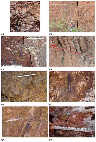 Examples of shear zones in the Kukuluma terrain: (a) Closely spaced magnetite-bearing sheeted quartz veins intruded along a D1 shear zone (Kukuluma pit); (b) Planar chert ridge (right) cuts at a low-angle through primary bedding in a meta-ironstone unit along access road to Kukuluma. The chert is interpreted as a D1 shear zone; (c) Planar chert horizon east of Area 3. The margin of the chert parallels S0 in the surrounding sediments, but internally the chert is folded with mylonitic characteristics attributed to D1; (d) D5 low-angle reverse fault and associated recumbent folding in chert in Kukuluma pit; (e) Cataclasite and tectonic breccia zone along the D6 shear zone in chert in Kukuluma pit; (f) D6, Kasata shear in the northwest corner of the Matandani pit; (g) D7 fracture plane characterized by the presence of (white) sericite and sulphide alteration in artisanal workings along the western wall of Matandani pit; (h) D7 fracture plane with (white) sericite and slickenlines indicative of normal-sinistral movement in artisanal workings along the western wall of the Matandani pit.