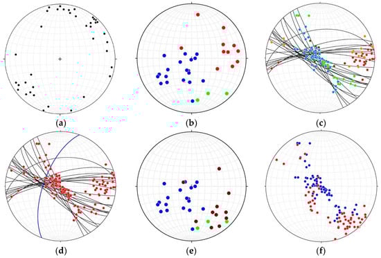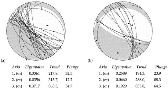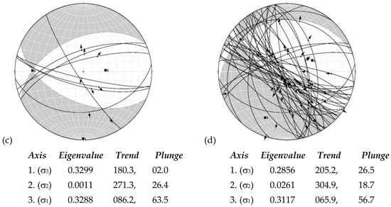As a general rule, the results from the paleo-stress analyses are best constrained for large data sets that combine fracture planes with different directions and movement sense. Thus, conjugate fracture sets, or Riedel, anti-Riedel, and P-shear arrays, provide good results that are more likely to be indicative of the regional paleo-stress field, especially if the stress inversion is based on at least 15 fracture planes [76,84]; sites in which only few planes, or planes in a limited number of directions, can be measured to provide at best an indication only of the local paleo-stress field, which may or may not conform with the regional results.