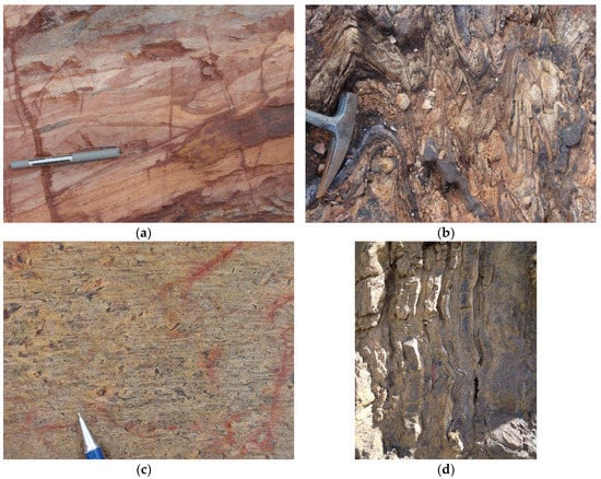 The orientations of the D6 fracture zones associated with the Juma and Kasata shears, as measured in the Kukuluma pit, are shown in Figure 9a. The main strands of the Juma and Kasata shears trend west-northwest (020/80), with a gently northwestern- or southeastern-plunging lineation recording a dextral sense of movement with a reverse component. A prominent set of second-order shears trends more northwest, with a steep southwest dip (average 235/75) and a moderately south-plunging lineation recording reverse dextral movements. A third set of steeply north-northwest- to northwest-dipping shear zones (average 324/72), with moderately to steeply north-plunging lineations record sinistral-reverse movements; in addition, a fourth set of steeply south-dipping, east–west trending faults (average 175/76) host down dip lineations and a pure reverse (south over north) sense of movement (Figure 9a). This network of shears is generally non-mineralized, and is consistent with Y-shears (the Juma shear), Riedel shears (northwest-trending set) and anti-Riedel shears (southwest-trending set) within a wider dextral transpressional shear system [46], which combines with high-angle reverse faults (the east-trending set). On a larger scale, the distribution of the main D6 shear zones is reminiscent of a right-stepping en-echelon array of west-northwest- to northwest-trending shears within a more east-west trending shear envelope, accommodating reverse dextral movement (Figure 3).