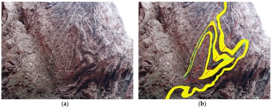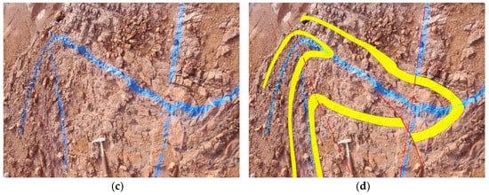 Examples of outcrop-scale D2–D3 fold interference patterns in the central Kukuluma terrain, shown as annotated pairs. Marker layers have been highlighted in yellow; the D2 fold axial trace is shown in light blue; the D3 fold axial trace is shown in red. (a,b) Vertical view of fold pair in erosion gully along the eastern face of Matandani pit; (c,d) Horizontal view of fold pair on the upper benches in the southwest corner of Matandani pit.