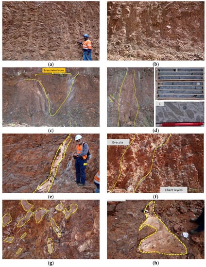 Examples of hydrothermal, syn-D3 breccia and intrusions in Kukuluma pit: (a,b) Progressive brecciation in meta-ironstones, including a complexly folded zone with crackle breccia, in which the original folded bedding is still visible (a), and more advanced brecciation, in which individual clasts have moved, but remnants of underlying folds are visible (b); (c) Layer-parallel breccia in the core of a D3 fold; (d) Fine-grained breccia pipe transecting a folded meta-ironstone package. The inset shows hydrothermal breccia in a diorite intrusive (drill hole ID: MTRD0005-588m); (e,f) Diorite dyke (outlined with yellow stipple line) with highly irregular margins is emplaced into the breccia zone; (g,h) Irregular blebs and fragments of diorite (outlined with yellow stipple line) mixed within the breccia near the intrusive contacts of the dyke shown in (e,f).