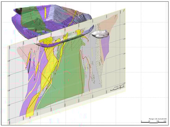 Example of a cross-section through Matandani pit, showing the ore distribution along the margin of a dioritic body (green) in contact with meta-ironstone (purple) and breccia (stipple). Other units include interbedded meta-ironstone, greywacke (light blue), and volcaniclastics (pink). The inferred position of D6 shear zones is shown with red stipple lines. The cut-off grade of the ore envelope shown in yellow is 0.5 ppm. The section is vertical and trends 060/240, right–left.