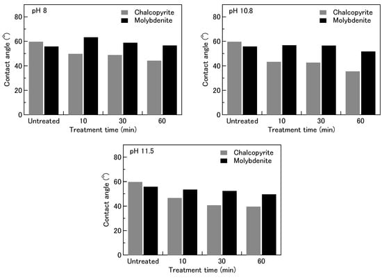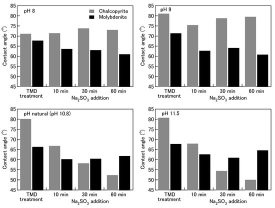 Figure 2 shows that the contact angle of chalcopyrite decreased after treated in 0.1 M Na2SO3. Moreover, the contact angle values of chalcopyrite decreased with increasing treatment time and pH, especially at pH 10.8 and 11.5, suggesting that Na2SO3 reduces the natural hydrophobicity of the chalcopyrite surface in the absence of TMD solution. On the other hand, the contact angle values of molybdenite slightly decreased with increasing treatment time and pH of 0.1 M Na2SO3 without the pretreatment (Figure 2). These results indicate that the surface of the molybdenite was slightly affected by the Na2SO3 treatment in the absence of the TMD solution.