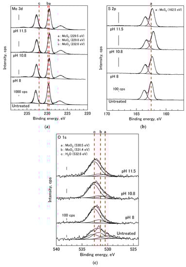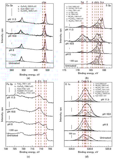 XPS analysis was performed to analyze the chemical composition of the surface before and after the Na2SO3 treatment. The mineral powders (ca. 1 g) were treated in 0.1 M Na2SO3 and the mixture pH was controlled at various values (8, 10, and 11.5) for 60 min. The sample was then filtered and freeze-dried for 1 day. Afterwards, XPS analysis was conducted for untreated and treated minerals by following the procedure applied in Hirajima et al. []. The X-ray photoelectron spectra of the mineral were collected using AXIS 165 (Shimadzu-Kratos Co., Ltd., Manchester, UK) with an Al Kα X-ray source (1486.6 eV) operated at 105 W and a charge neutralizer. The analysis area was 1 mm × 1 mm and the pressure in the analyzer chamber was 10−8 Pa. The collected spectra were analyzed with Casa XPS (Ver. 2.3.16). Background corrections were made using the Shirley method [] for the C1s, O1s, Fe2p, Cu2p, S2p, and Mo3d spectra. The peak shapes were defined using a Gaussian–Lorentzian function. The binding energy (EB) calibration was based on C1s at EB[C1s] = 284.6 eV.