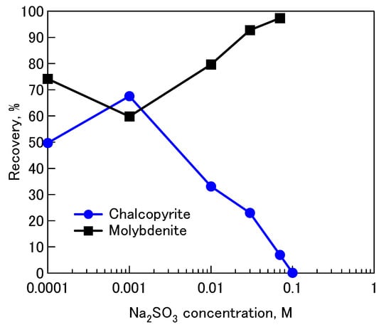 Effect of various concentrations of Na2SO3 on floatability of single minerals of chalcopyrite and molybdenite at pH 10.8.