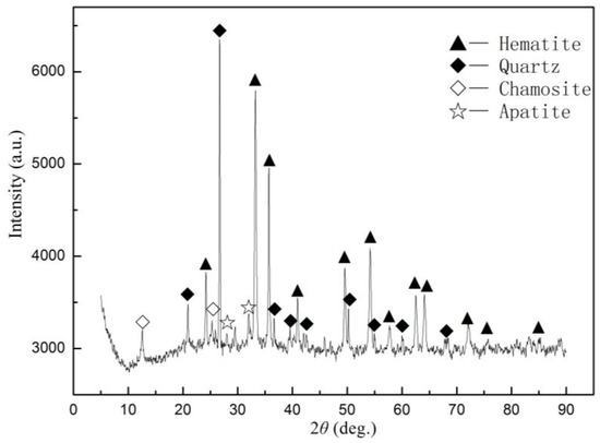Oolitic hematite ore is a significant existing form of iron ores, which are widely distributed in France, Germany, the United States, Canada, Pakistan, China, and other countries [1,2]. In China, 3.72 billion tons of explored reserves of oolitic hematite ores accounts for approximately 1/9 of total iron ore resources [3]. As one of the most refractory iron ores in the world, oolitic hematite ore possesses complex composition, microstructure, and embedded relationship [4,5], contains some metallic minerals, such as hematite (Fe2O3), siderite (FeCO3), and limonite (Fe2O3·nH2O), and comprises some non-metallic minerals, such as quartz (SiO2), chamosite [(Fe,Mg)3(Fe,Fe)3[AlSi3O10](OH)3], and collophanite (Ca3P2O8·H2O). These ultra-fine-grained minerals cement together to form a disseminated oolitic structure.