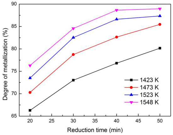 In Figure 2, we observed that the degree of metallization of the reduced samples markedly increased as reduction time was extended. For instance, when the reduction temperature was at 1473 K, the degree of metallization improved from 70.29% to 85.47% with a reduction time of 20–50 min. Moreover, the increasing rate of metallization was gradually decreased as reduction time was extended. In other words, each curve would increase and achieve a stable degree of metallization as reduction time was prolonged in an atmosphere with a relatively sufficient concentration of CO. The time required to reach a stable degree of metallization was shorter at a high reduction temperature than at a low temperature. The vertical comparison among the four curves in Figure 2 reflected that the degree of metallization remarkably increased as reduction temperature increased at a fixed reduction time. For instance, when the reduction time was 40 min, the degree of metallization increased from 76.81% to 88.65% with the reduction temperature ranging from 1423 K to 1548 K.