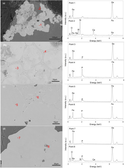 As illustrated in Figure 5d, the boundaries gradually faded and disappeared as reduction and diffusion continuously occurred. A bright and homogeneous iron particle was formed. At the same time, some tiny slag inclusions were embedded in the large iron particle. However, the EDS result indicated that the inclusions were based on Fe–O–Si–Ca–P (point 8). These compound inclusions were disregarded in this study.
