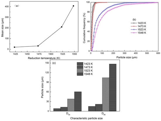 Figure 6 shows that the mean size, cumulative frequency distribution, and characteristic particle size at various temperatures for 30 min. Iron particle size markedly increased as the reduction temperature increased possibly because increasing reduction temperature could accelerate the reduction reactions of iron oxide and the diffusion of metallic iron. In Figure 6a, the mean size of metallic iron particles obviously increased as reduction temperature increased, revealing that increasing the reduction temperature was conducive to the growth of metallic iron particles. The two stages were analyzed according to the growth rate as temperature increased. When the reduction temperature increased from 1423 K to 1473 K, the mean size of metallic iron particles slowly grew from 19.47 μm to 31.11 μm. The growth rate of metallic iron particles in this stage might be mainly controlled by the reduction reaction rate of iron oxide to metallic iron. When the reduction temperature increased from 1473 K to1548 K, the mean size of metallic iron particles quickly grew from 31.11 μm to 407.33 μm. The growth rate of metallic iron particles in this stage might mainly be controlled by the diffusion rate of metallic iron. Figure 6b shows that the cumulative frequency evidently increased with iron particle size, especially when the particle size was small. Small particles constituted a large proportion, whereas large particles accounted for a small proportion. The curves of cumulative frequency systematically shifted rightward as reduction temperature improved, reflecting that the number of large particles increased and iron particles grew gradually as the reduction temperature increased. For instance, the D50 and D80 of iron particles at a fixed reduction time of 30 min increased from 8.47 and 15.32 μm to 60.62 and 147.05 μm, respectively, as the reduction temperature increased from 1423 K to 1548 K (Figure 6c).