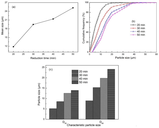 Figure 7 shows the mean size, cumulative frequency distribution, and characteristic particle size as the reduction time was extended at a fixed temperature of 1423 K. Similarly, the iron particle size evidently increased as the reduction time was extended. Figure 7a illustrates that the mean size of metallic iron particles gradually increased as the reduction time was extended, indicating that extending reduction time helped generate additional metallic iron and its diffusion. For instance, the mean size increased from 11.81 μm to 25.19 μm as the reduction time was prolonged from 20 min to 50 min. From Figure 7b, the cumulative frequency also increased with iron particle size. When the reduction time was extended from 20 min to 50 min, the curves of cumulative frequency consecutively shifted rightward, implying that the number of large particles increased, and iron particles grew gradually as the reduction time was prolonged. For instance, D50 and D80 of iron particles at a fixed reduction temperature of 1423 K increased from 5.16 and 8.95 μm to 13.96 and 24.15 μm, respectively, as the reduction time was extended from 20 min to 50 min (Figure 7c).