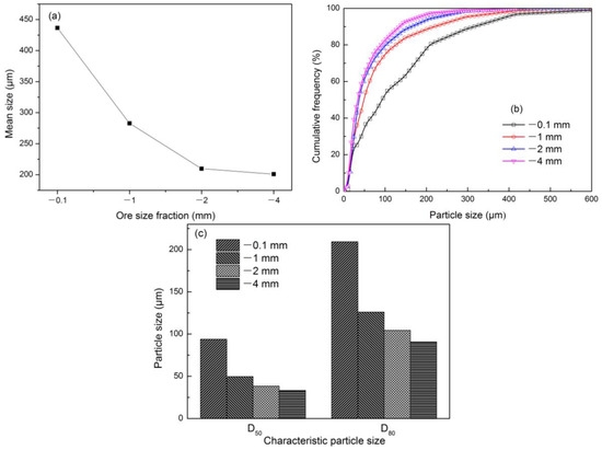 Effect of ore size fraction on iron particle size at 1523 K and 30 min: (a) Mean size; (b) cumulative frequency distribution; (c) characteristic particle size.