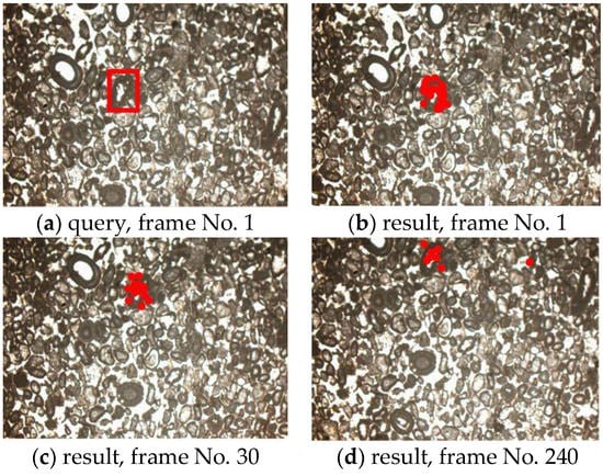 An example of points that meet the criteria of matching the query image and exemplary frames of video sequences for grain tracking, for selected frames numbers (frame No.).