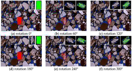 Less satisfactory results were obtained for objects registered at different angles of microscope set-up (Table 3). Figure 4 shows a sample search of a rotated object, recorded with a polarized microscope. An image of quartzite was registered with α angle equalling 0°–330° and a step of 30°. A change in the position of a rotary table caused the change of colour (Figure 4a,d), which significantly influenced the quality of the search, especially since the query image is not rotated, i.e., it does not change its colour.