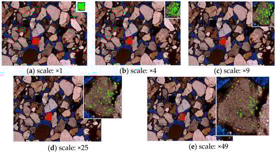 Constructing search by image methodology in geology is challenging, since it is also a question of object detection similar to a query but registered with different magnifications. Such an issue should be considered in two ways: in the context of a geological data analysis (computer-scaled images, see Figure 5), and in the context of images retrieved with different microscope magnifications (Figure 6). The results of correct feature detection for a computer-scaled query image are presented in Table 4. An image search under different enlargements, with scaling performed by computer methods, rendered satisfactory results only for the SURF method; however, it was sensitive to significant data reduction. SURF ensures that the points of interest are scale-invariant by transforming the image using the multi-resolution pyramid technique, to copy the original image with a Gaussian pyramid or Laplacian pyramid shape, in order to obtain an image with a special blurring effect on the original image, called scale-space [29,30].