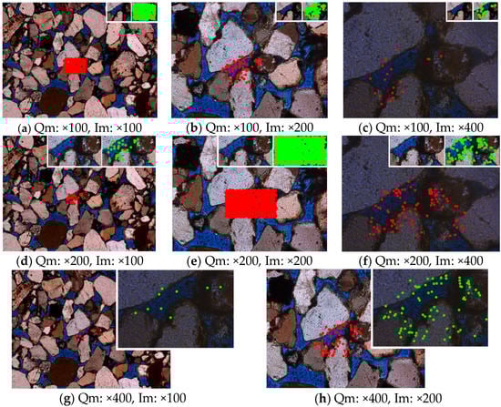 Effects of the detection of interest points using the microscope magnified query image (green points) and original image (red points) obtained for the SURF method, sandstone from Solec (Qm—Query magnification, Im—Image magnification).