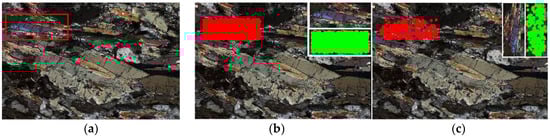 Microscopic image of amphibolite from Spitsbergen with marked fragment—search query (a). Effects of the detection of interest points using query image (green points) and original image (red points), when using: selected fragment (b), rotated and scaled fragment (c) (magnification: ×100).