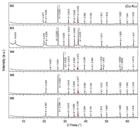 The positions of reflections of different orders in sample M3 after saturation with ethylene glycol are 17.0 Å—(001), 8.5 Å—(002), 5.5 Å—(003) (Figure 2). The behavior of the pattern of sample M3 is identical to that of sample M4, where the smectite reflections shift to small angles upon saturating the sample with ethylene glycol. For this case, the positions of the reflections of different orders 17.0 Å—(001), 8.5 Å—(002), 5.5 Å—(003) are stable in sample M4. After heating, the smectite reflections shift to the illite ones. Sample M3 in the highest concentrations contains kaolinite and smectite clay minerals. At the same, time the prevalence of calcite is observed in sample M4. In sample M5, we found the dispersed phases of MLM illite-smectite minerals with low content of smectite component (16–18 Å) from the change of position of the basal reflections of clay minerals after saturation with ethylene glycol (Figure 2). After heating, the smectite reflections collapse to the illite ones. Content of non-clay mineral quartz prevails in this sample (~50%).