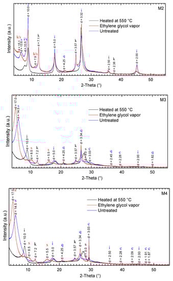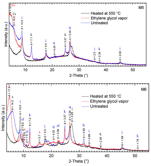 The XRD patterns of oriented preparations revealed the presence of mixed-layer clay minerals (MLM) in samples M2, M5. However, even the most accurate contemporary QXRD mineral analysis of rocks is capable of measuring only the total 2:1 (1:1) clay minerals (i.e., the sum of illite (kaolinite) + MLM minerals) [38,45]. The relative amount of mixed layers of illite-smectite and kaolinite-smectite has been estimated from the intensity and changes in peak positions of their reflections in the XRD patterns from oriented preparations following the method of Moore and Reynalds (1989) [46]. Identification of the MLM is made for the case of a clay mineral as a regularly interstratified species [47]. For example, smectite layers are expected to swell to ~1.7 nm with ethylene glycol and to collapse to ~1.0 nm on heating, while illite layers remain stable.